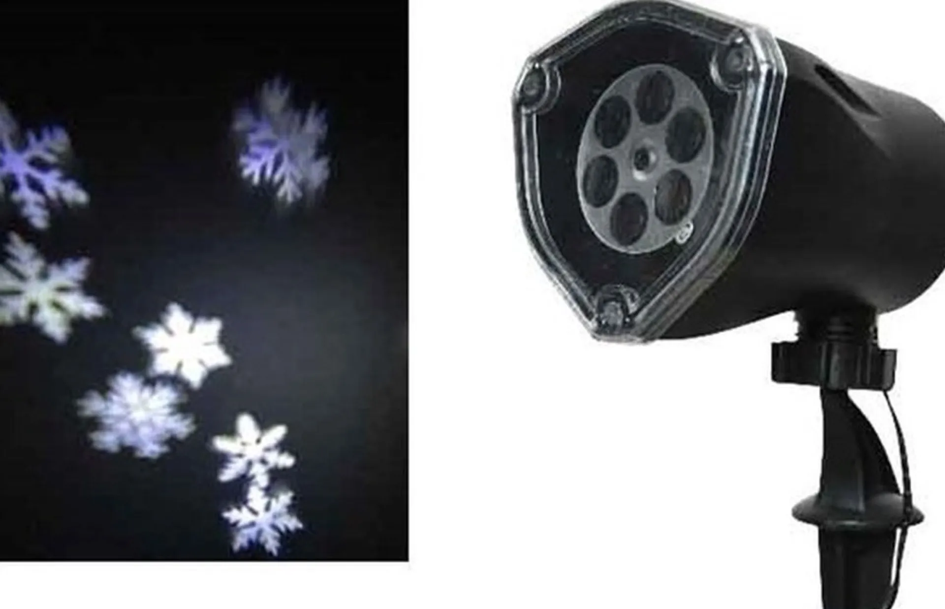 Kerst Sneeuwvlokken Projector Voor Buiten. Deze Led Projector Projecteert Sneeuwvlokken. U Kunt De Projector Op Diverse Plekken Richten Voor Een Mooi Sneeuwvlok Effect, Bijvoorbeeld Op Uw Woning. Lengte Van De Kabel: 3 Meter. Maximale Afstand Voor Projectie: 3 Tot 5 Meter. Ce – Dekra Gs On Transformer.