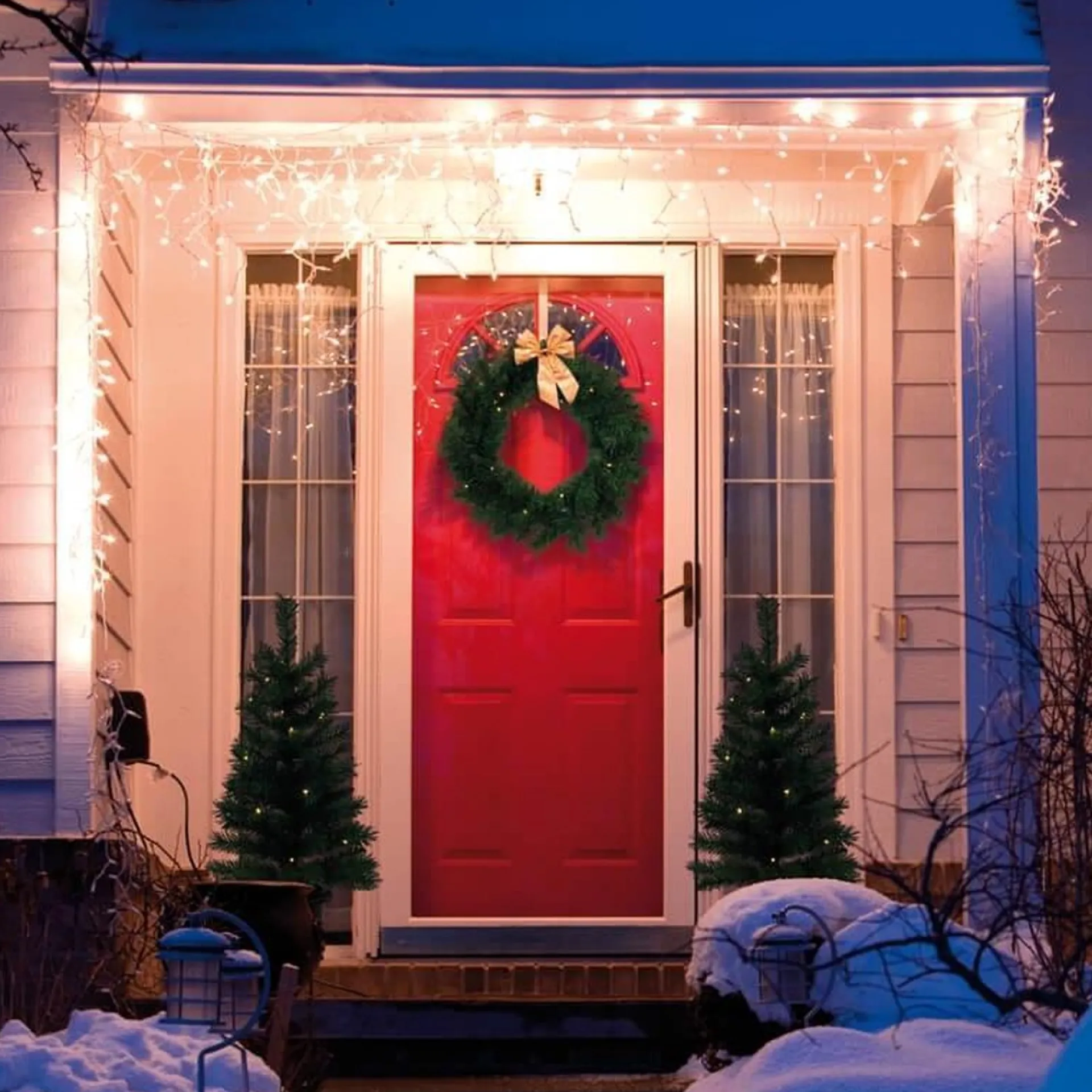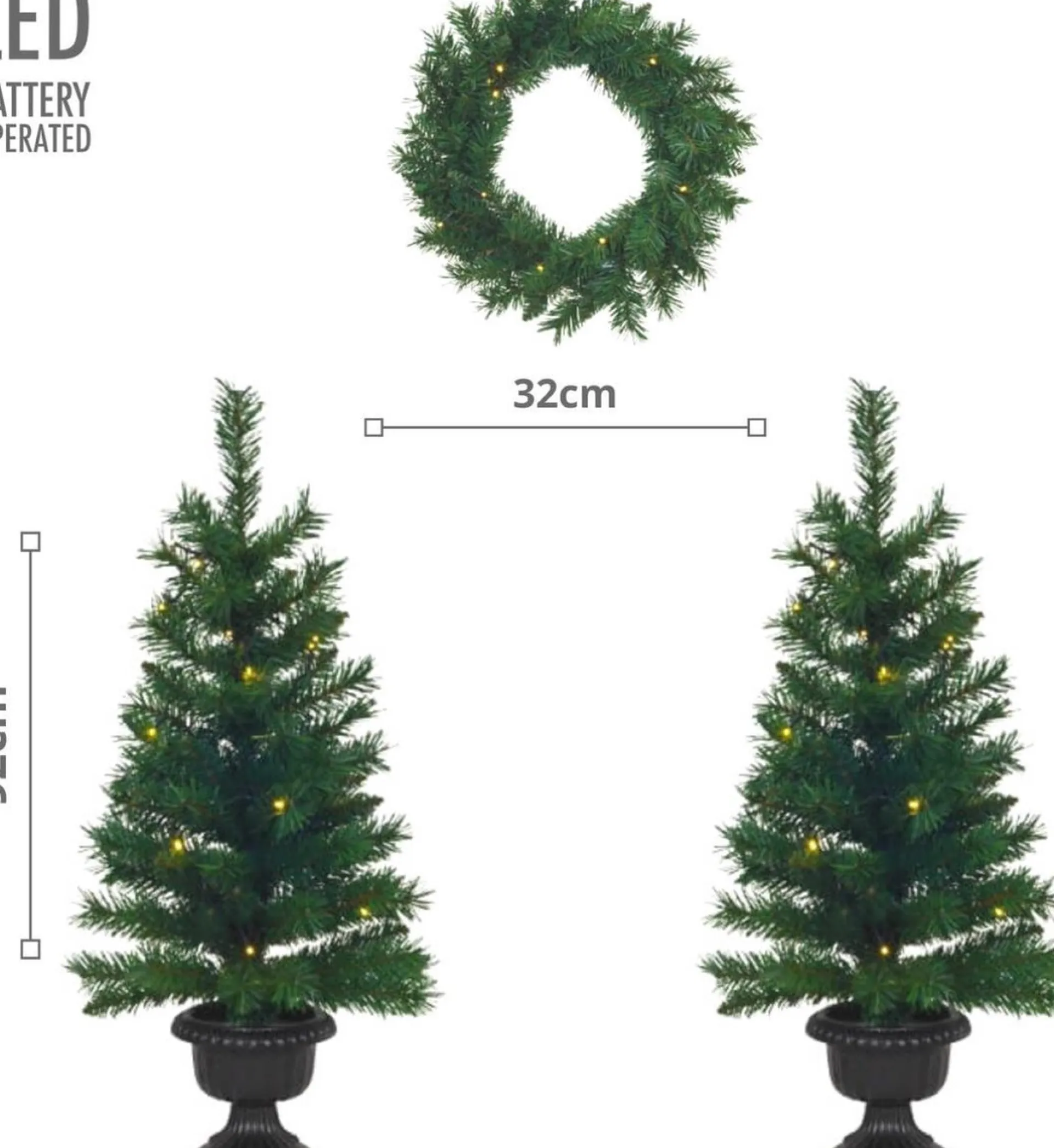 Haal Deze Prachige Driedelige Set Bestaande Uit 2 Kunstkerstbomen Met Pot En Een Kerstkrans In Huis Voor Deze Kerst. Deze Unieke Kerstversiering Rijk Uitgevoerd Met Led Kerstverlichting Is Ideaal Om Je Voordeur Mee Te Versieren. Zet Aan Weerszijde Van Je Voordeur Een Kerstboom Neer. Deze Staan Mooi In De Bijgeleverde Potten En Maak Het Geheel Af Met De Krans Op Je Voordeur. Batterijen Erin, Timer Instellen En Genieten Van De Mooiste Entree Van De Straat En Die Unieke Kerstsfeer! , Highlights: Set Bestaat Uit: 2 Bomen En 1 Krans, Kerstbomen (2 Stuks): 92Cm Hoog, 72 Takjes, Kerstkrans: 32Cm Diameter, 80 Takjes, Met Timerfunctie: 6 Uur Aan – 18 Uur Uit, Geschikt Voor Binnen En Buiten (Beschermwaarde Ip44), Werkt Op 3Xaa Batterijen (Niet Meegeleverd)