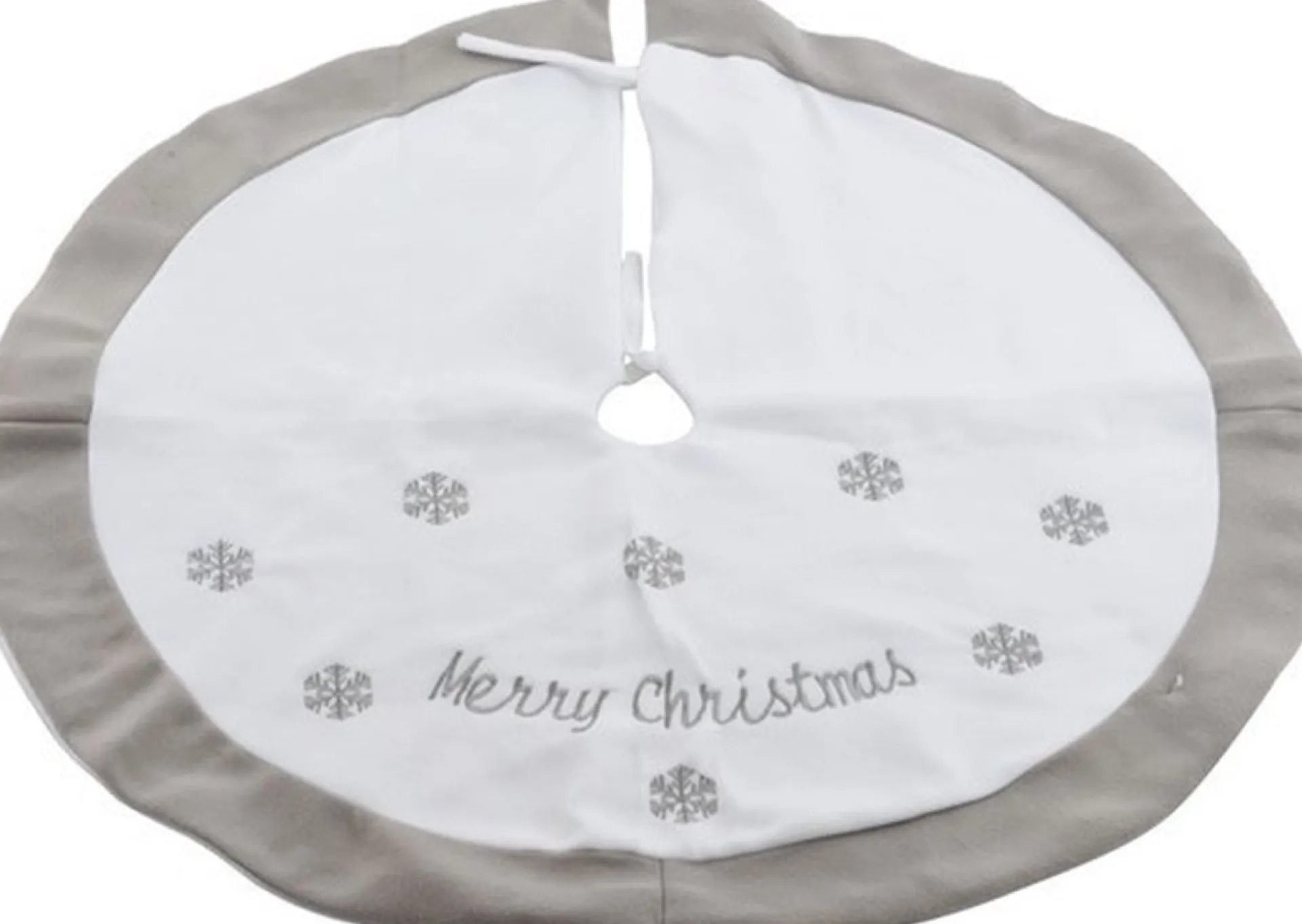 Kerstboomrok / Kerstboom Kleed Wit Met Grijze Sneeuwvlokjes En Tekst Merry Christmas 89 Cm. Een Witte Ronde Rok / Kleed Om Aan De Onderkant Van De Kerstboom Te Draperen. Deze Kerstboom Rok Is Gemaakt Van Polyester En Heeft Een Diameter Van 89 Cm.