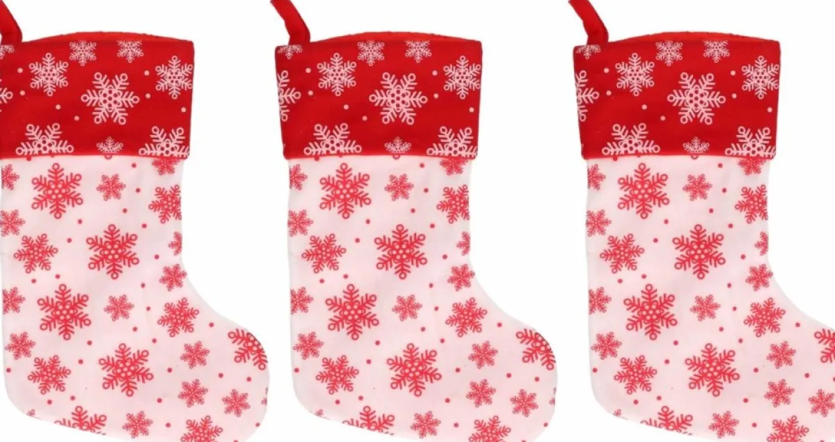 3X Wit/Rode Kerstsokken Met Sneeuwvlokken Print 40 Cm. Kerstversiering/Kerstdecoratie Sokken Om Bijvoorbeeld Aan De Openhaard Te Hangen. Formaat: Ongeveer 40 Cm. Materiaal: Polyester.