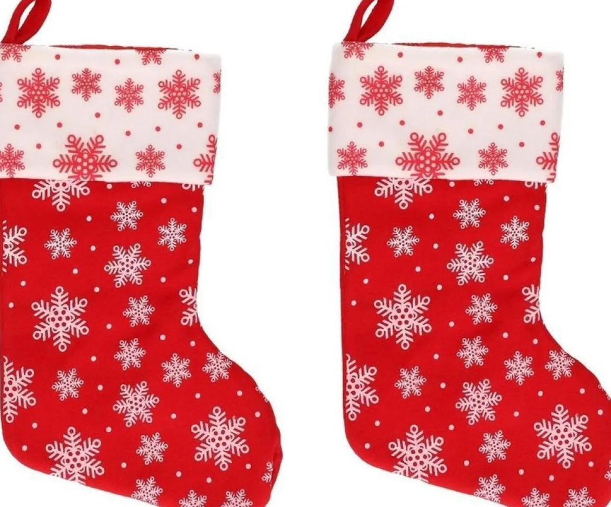 4X Rood/Witte Kerstsokken Met Sneeuwvlokken Print 40 Cm. Kerstversiering/Kerstdecoratie Sokken Om Bijvoorbeeld Aan De Openhaard Te Hangen. Formaat: Ongeveer 40 Cm. Materiaal: Polyester. Aantal: 4X.