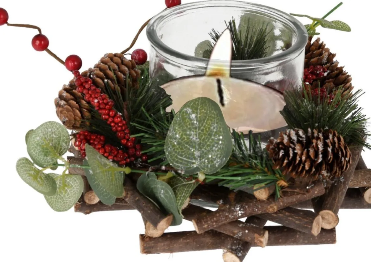 Kerststukje Met Theelichthouder En Decoratie 20 X 12 Cm Kerst Tafeldecoratie. Materiaal: Kunststof/Hout. Kant En Klare Kerststukjes/Kerstversiering Voor Op Tafel.