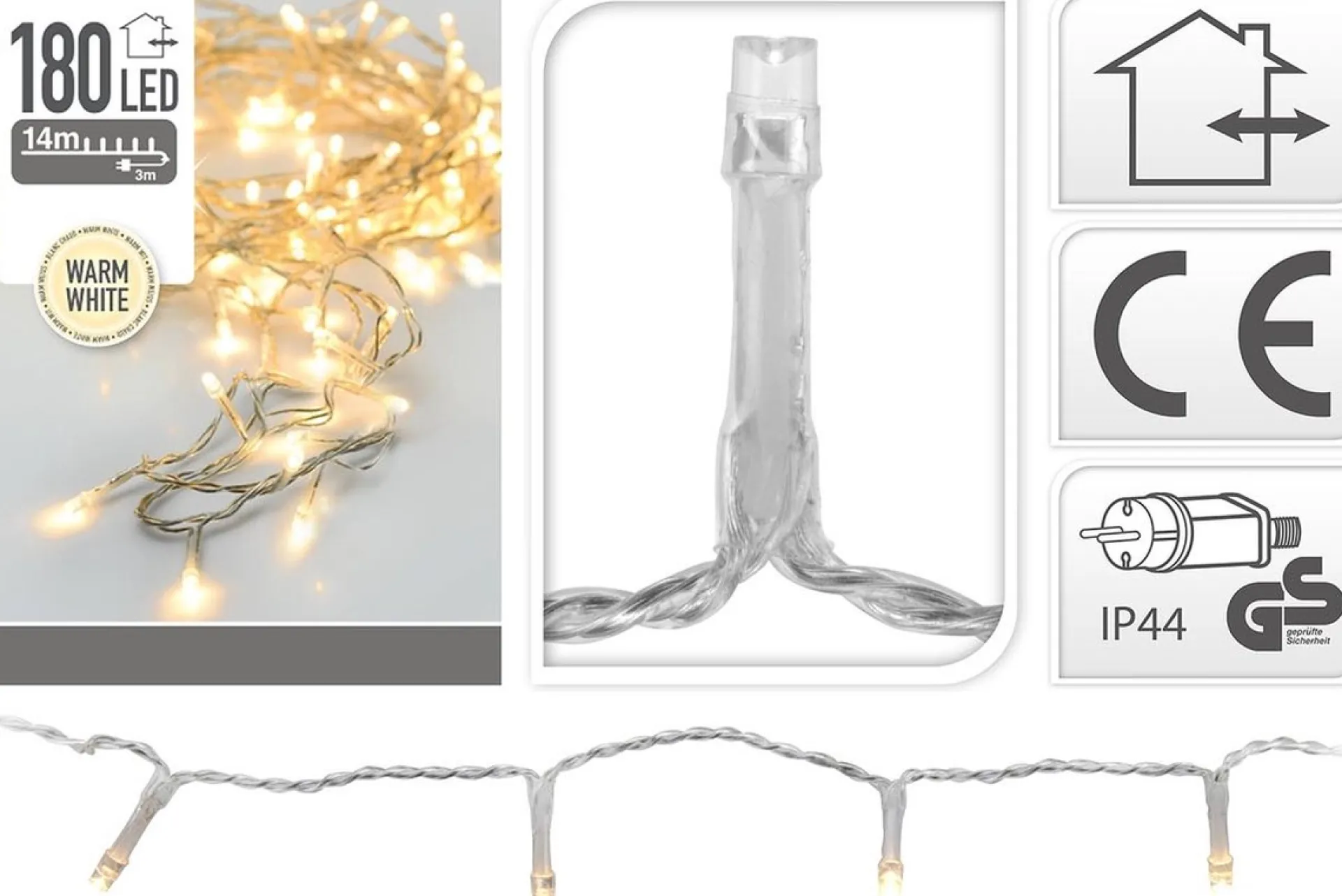 Kerstverlichting Transparant Snoer Met 180 Warm Witte Lampjes 13,5 Meter. Warm Witte Kerstverlichting Aan Transparant (Doorzichtig) Snoer. Aantal Lampjes: 180. Kleur Snoer: Transparant. Kleur Licht: Warm Wit. Geschikt Voor Binnen En Buiten. Lengte Lichtsnoer: 13,5 Meter (1350 Cm). Aanloopsnoer: 3 Meter (300 Cm). Voeding: Stroom, Ip44 Adapter, 230 V/50Hz. Afstand Tussen De Lampjes: 7,5 Cm.
