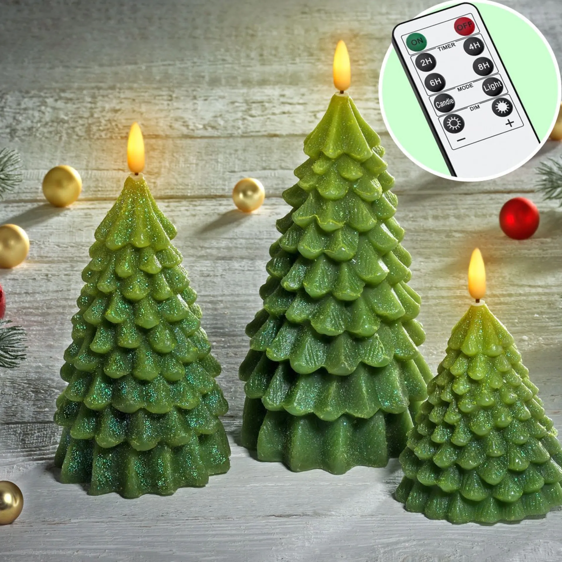 Indrukwekkende Kaarsen Van Echte Was In De Vorm Van Een Dennenboom Met Sfeervol Ledlicht. De Groene Dennenbomen In 3 Verschillende Maten Zijn Bedekt Met Glitter Die Prachtig Fonkelt In Het Kaarslicht. Te Bedienen Met Een Afstandsbediening.