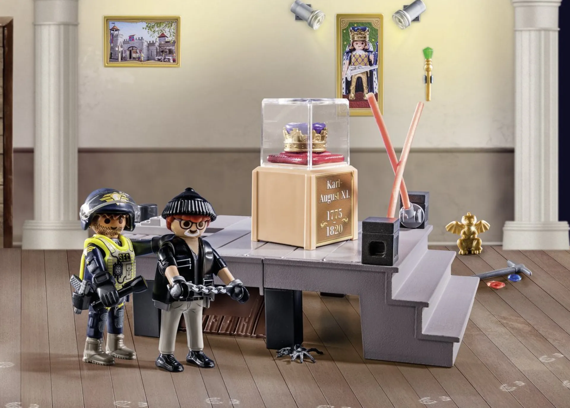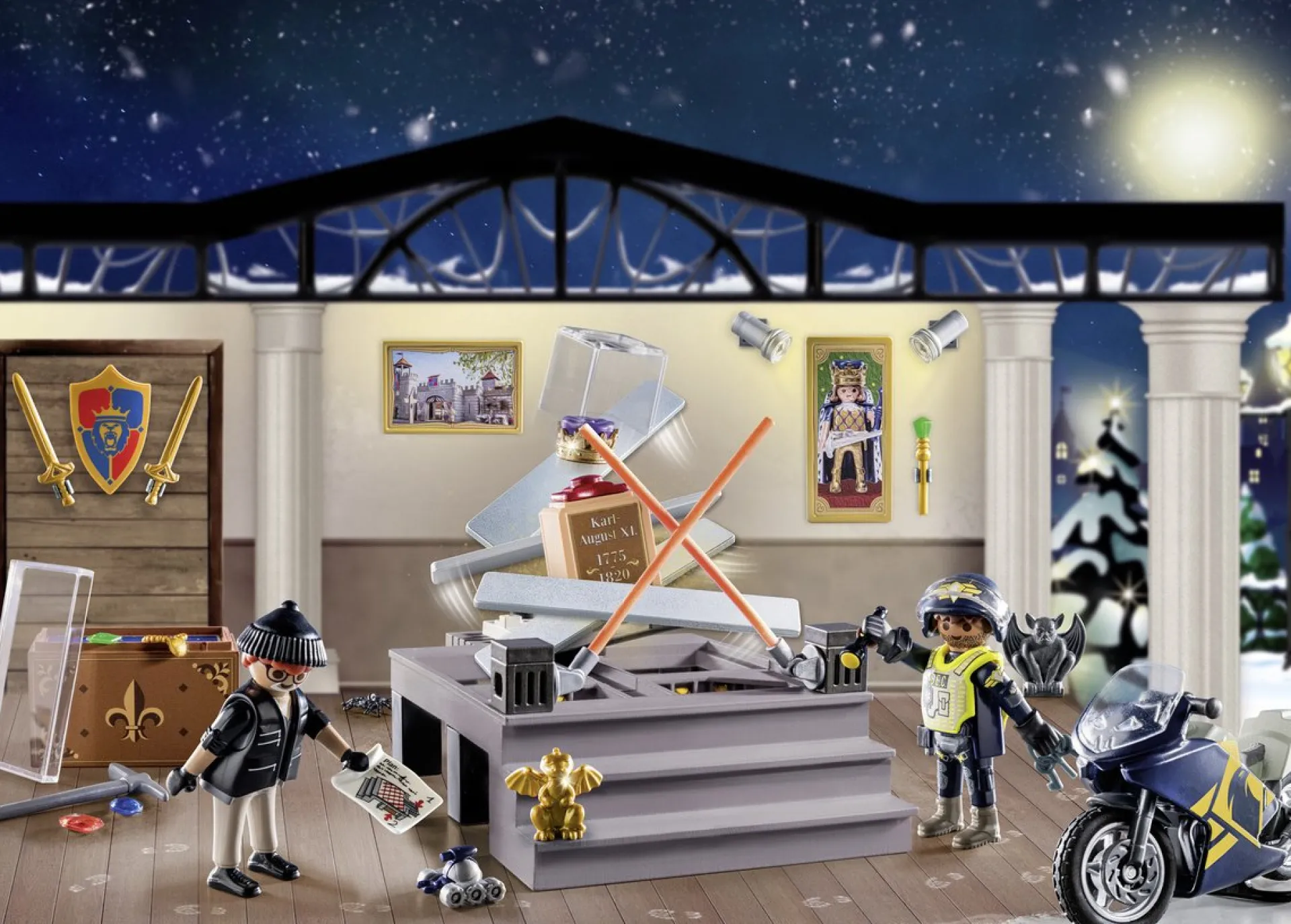 Zelfs Tijdens De Pre-Kerstperiode Rust De Misdaad Niet. Tijdens De Museumdiefstal, Proberen Inbrekers Waardevolle Voorwerpen Te Stelen. In De 24 Dagen Tot Kerstmis Wordt Een Diorama Met Het Inbraakscenario Gemaakt. De Sokkel “”Stort”” Met Een Druk Op De Knop “In”. Inclusief Een Politiemotor.