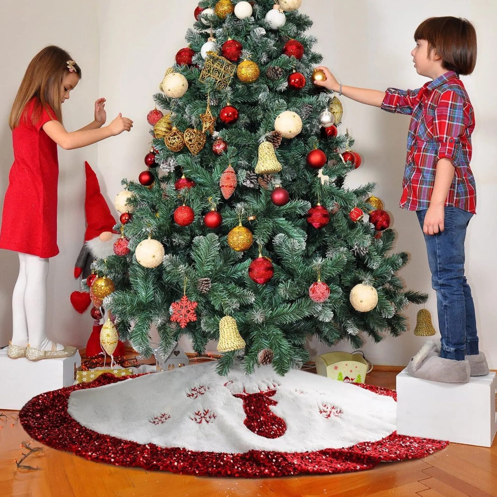 Hoogwaardig Materiaal: Deze Pluizige Dennenboomdeken Is Gemaakt Van Hoogwaardig Kunstbont Met Een Zacht En Aangenaam Gevoel In De Hand. De Klassieke Kleur Wit Is Versierd Met Zwarte Of Rode Pailletten, Zodat De Boomdeken In Het Oog Valt En Je Kerstdecoratie Meer Interesse Geeft
