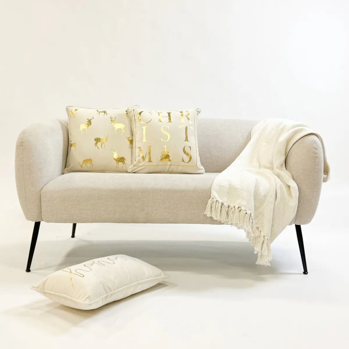 Sierkussen.nl Kerstkussens>Set Van 3 Sierkerst Kussens – Wit En Goud – 1X Deer – 1X Christmas – 1X Merry – Inclusief Polyester Vulling – Zachte Stoffen – Sfeerkussens