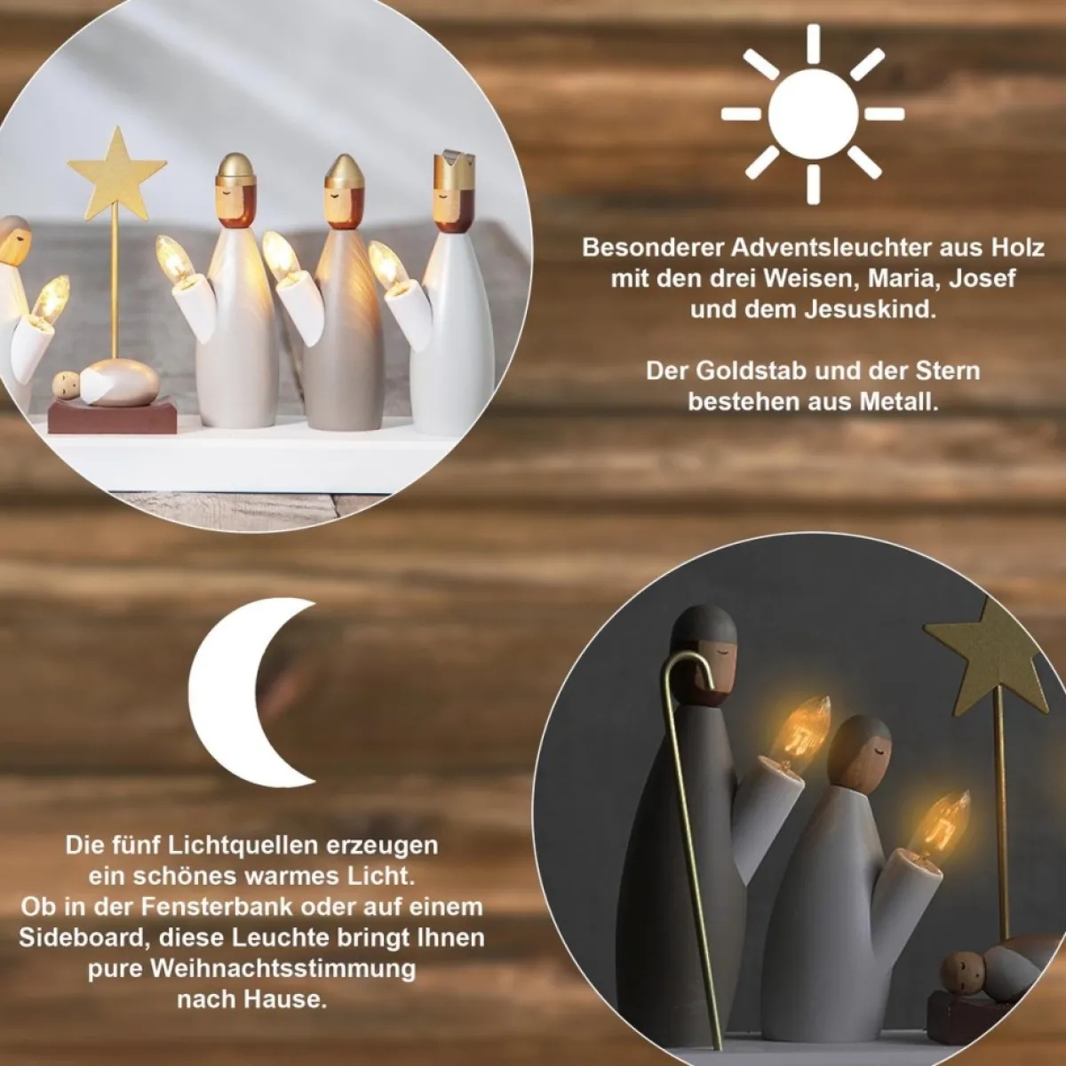 Houten Kandelaar Met De Drie Wijzen, Maria En Jozef. Het Jezuskind Ligt Op Een Bed. Een Geverfde Gouden Staaf En Ster In Metaal Zijn Ook Inbegrepen. 5 Lichtbronnen Inbegrepen. Zet Hem Op Een Dressoir Of In Een Veranda Om Een Heerlijke Kerstsfeer In Huis Te Verspreiden. Kleur: Multi, Kleur Stroomkabel: Wit, Lichtbron Kleur: Helder, Breedte / Lengte (Cm): 33,00, Hoogte (Cm): 17.00, Diepte (Cm): 9.00, Toepassingsgebied: Binnen, Aantal Lampen: 5, Lichtbron Inbegrepen: Ja, Dop / Dop: E10, Schakelaar: Ja, Gemiddelde Levensduur (H): 1000, Totaal Effect (W): 15, Lampstroom (Ma): 55, Lampeffect (W): 3, Lampspanning (V): 55V, Spanning: 230V Wisselstroom, Lengte Stroomkabel (Cm): 180, Power Cable Specificatie: H03Vvh2-F, Afstand Tussen Stekker En Schakelaar (Cm): 150, Afstand Tussen Schakelaar Naar Apparaat (Cm): 30, Ip-Klasse: Ip20