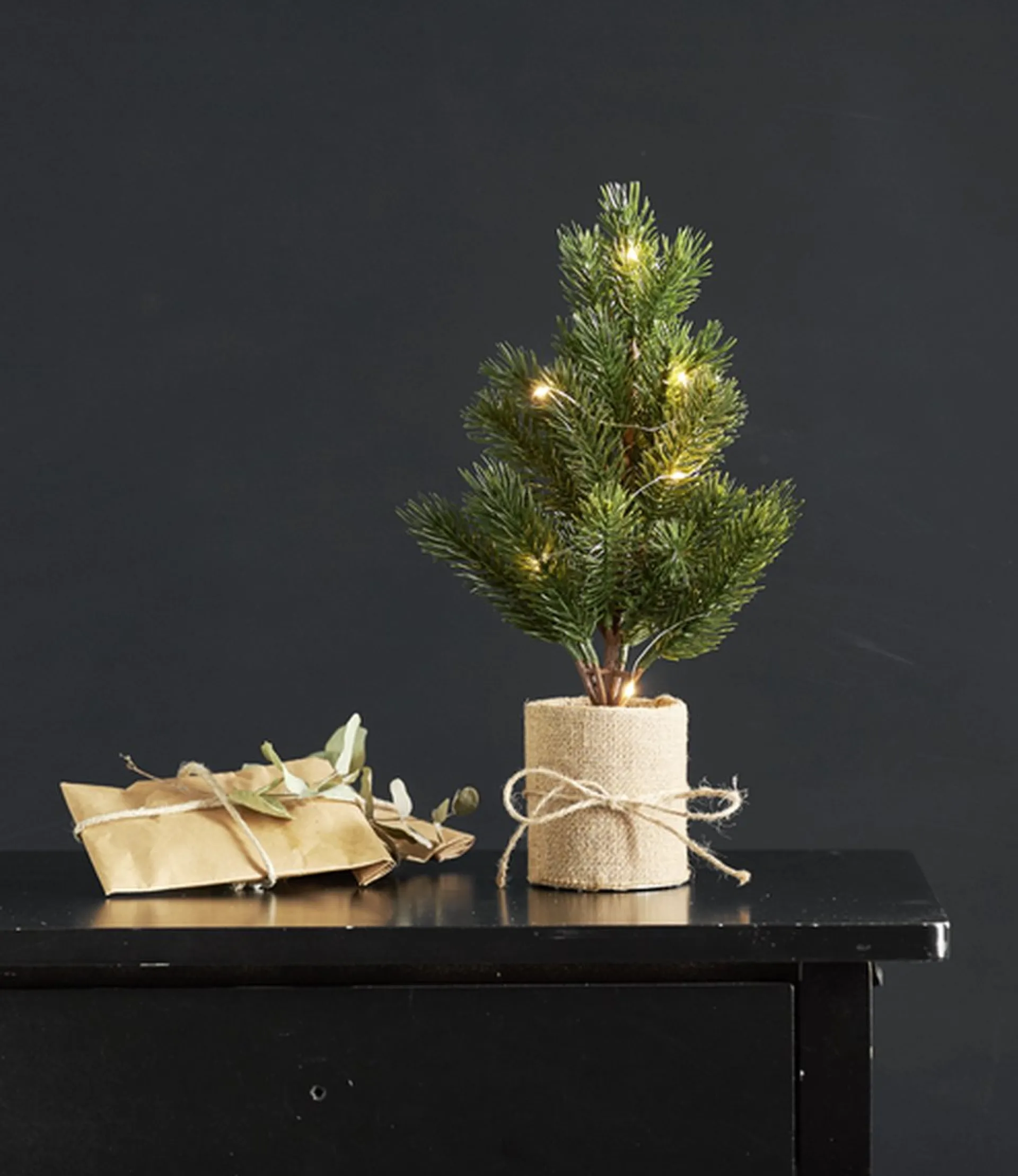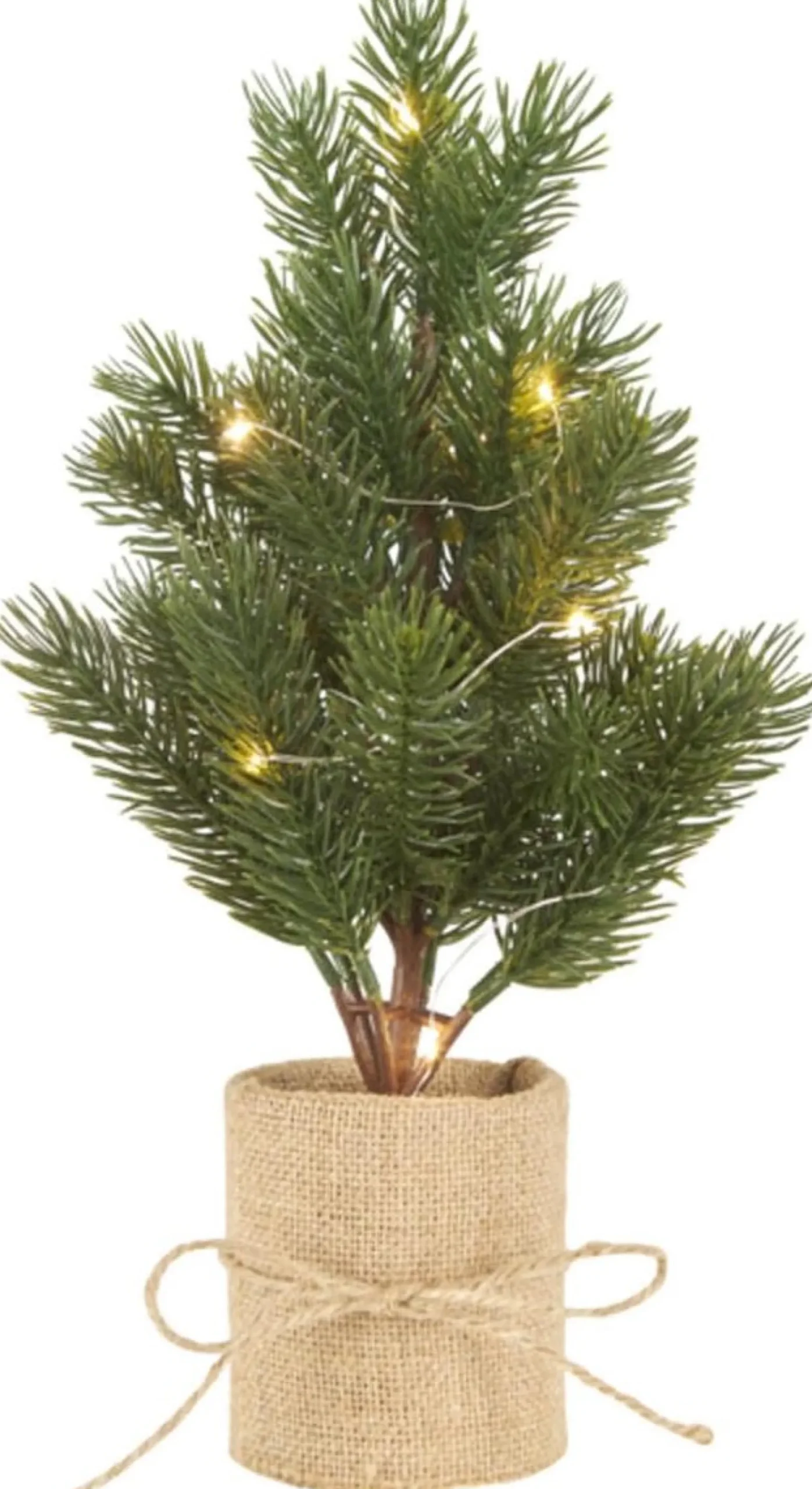 Mini Decoratieve Kerstboom Met Led Verlichting (Dew Drop). De Kerstboom Heeft Een Juten Zak/Pot Als Houder.