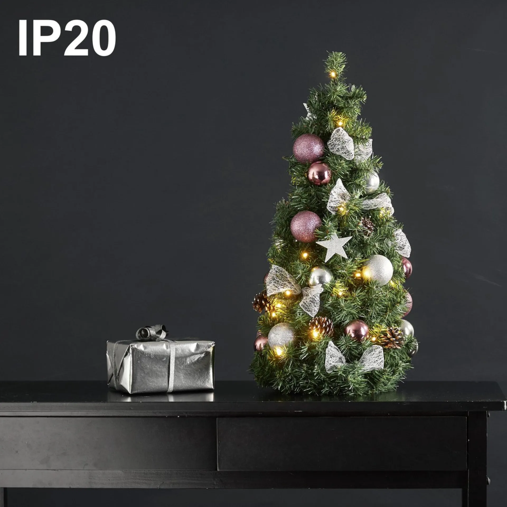 - Kleine Kerstboom Bestaande Uit Donkergroene Kunstmatige Dennentakken (Allergievriendelijk) En Zilveren En Roze Kerstballen, Strikken En Dennenappels. De 42 Led’s Zorgen Voor Een Gezellige Sfeer In Uw Woonruimte