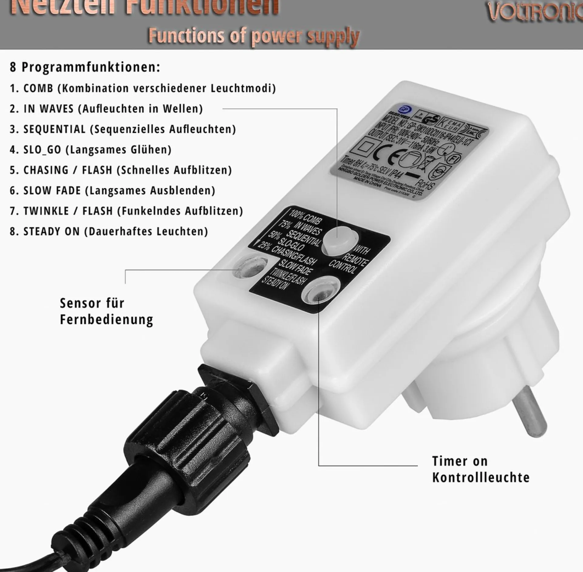 De Afstandsbediening Maakt De Lichtketting Eenvoudig In Gebruik. Deze Afstandsbediening Is Namelijk Voorzien Van 8 Verschillende Lichtstanden, Waaronder: Combinatie, Lichtgolf, Sequentiele Stand, Gloed, Flits, Vervagen, Fonkelen En Constant Licht. Daarnaast Vind Je Een Dimfunctie (100%, 75%, 50% En 25%) En Timerfunctie (Automatisch 6U Aan / 18U Uit) Op Deze Afstandsbediening.