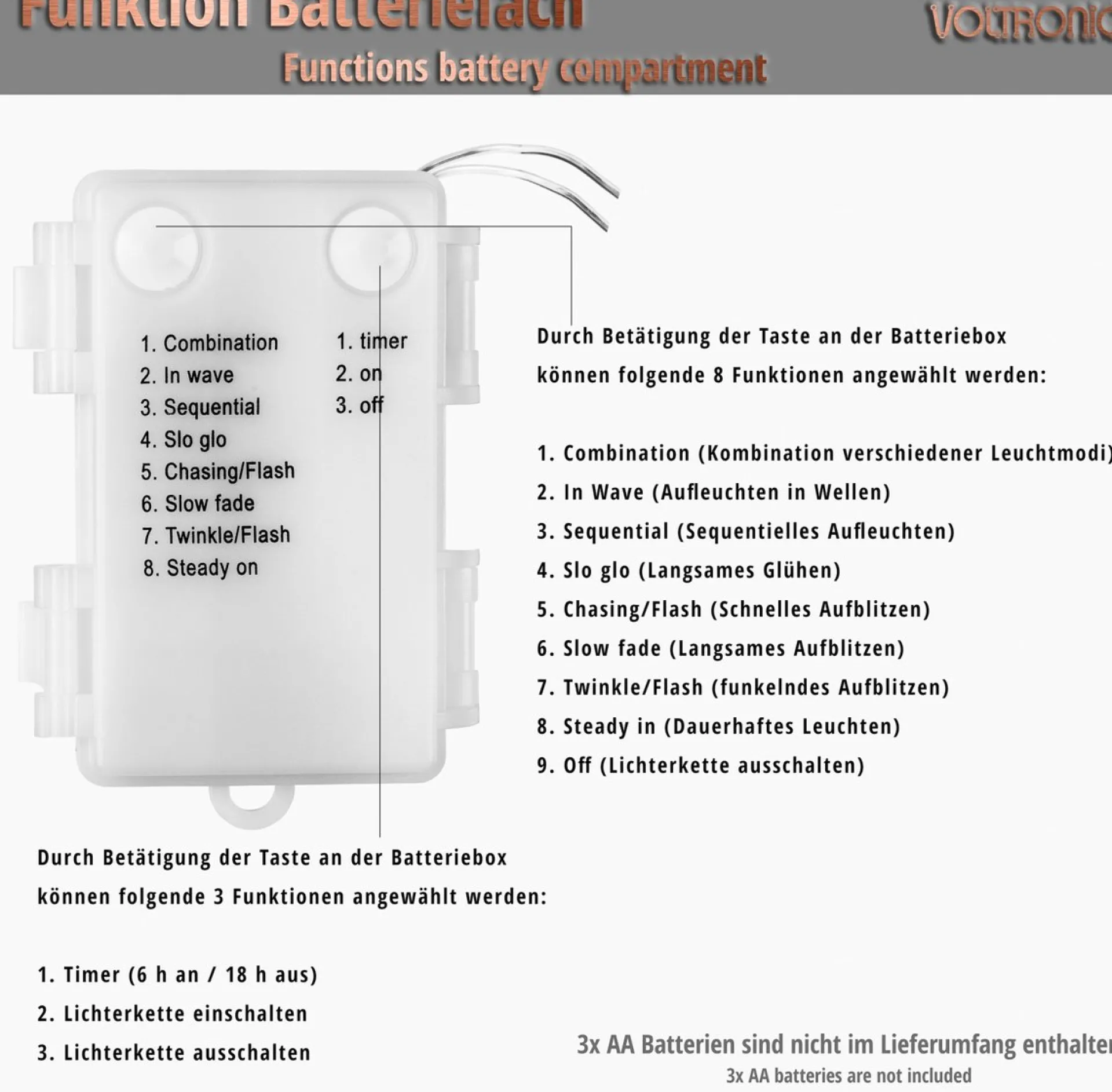 Het Batterijcompartiment Is Voorzien Van Twee Knoppen Die Eenvoudig Zijn In Gebruik. De Linkerknop Heeft 8 Verschillende Lichtstanden, Waaronder: Combinatie, Lichtgolf, Sequentiele Stand, Gloed, Flits, Vervagen, Fonkelen En Constant Licht. Met De Rechterknop Kun Je De Lichtketting Aan En Uit Zetten Of Gebruik Je De Handige Timerfunctie (Automatisch 6U Aan / 18U Uit).