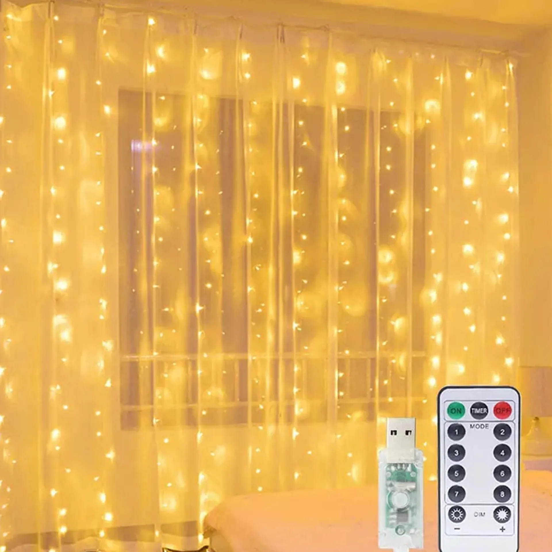 Dit Lichtgordijn Wordt Geleverd Met Een Afstandsbediening Om Het Lichtgordijn Op Afstand Mee Te Bedienen. Ook Kunt U, Met De Meegeleverde Afstandsbediening, De Kerstverlichting Van Modus Laten Wisselen. Er Zijn 8 Verschillende Lichtmodus Om Uit Te Kiezen: Combinatie, Opeenvolgend, Flits, Twinkelen, Zwaaien, Langzame Gloed, Langzame Vervaging En Continu Aan. Deze Draadloze Kerstverlichting Bezit Over Een Timer Functie. De Afstandsbediening Van Het Lichtgordijn Heeft Een Bereik Van 5 Maximaal Meter.